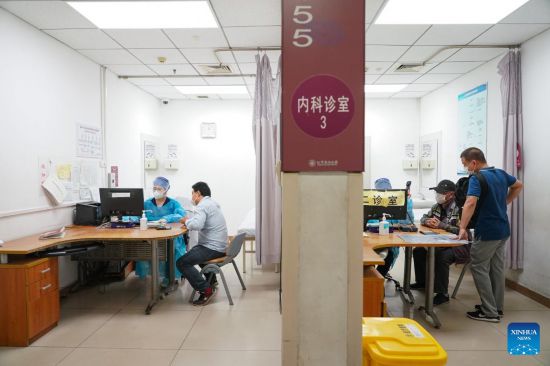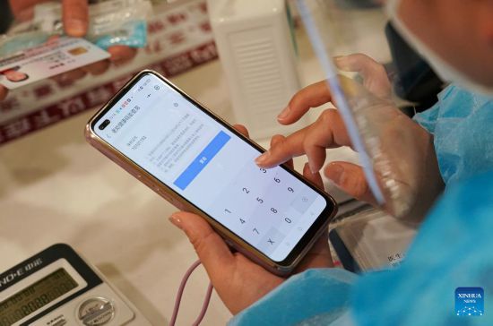 A medical workers helps a senior patient check his health tracking code on the phone at Beijing Chao-Yang Hosptial in Beijing, capital of China, May 2, 2022. Amid the recent COVID-19 resurgence, staff members at Beijing Chao-Yang Hospital have been working hard to maintain efficient emergency medical services. (Xinhua/Chen Zhonghao)