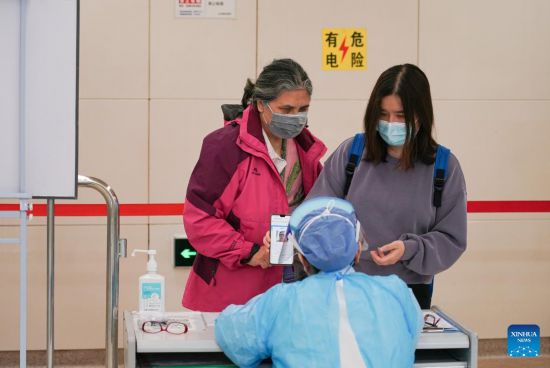 A patient and her family member show negative nucleic acid test results to a medical worker before entering the emergency department of Beijing Chao-Yang Hosptial in Beijing, capital of China, May 2, 2022. Amid the recent COVID-19 resurgence, staff members at Beijing Chao-Yang Hospital have been working hard to maintain efficient emergency medical services. (Xinhua/Chen Zhonghao)
