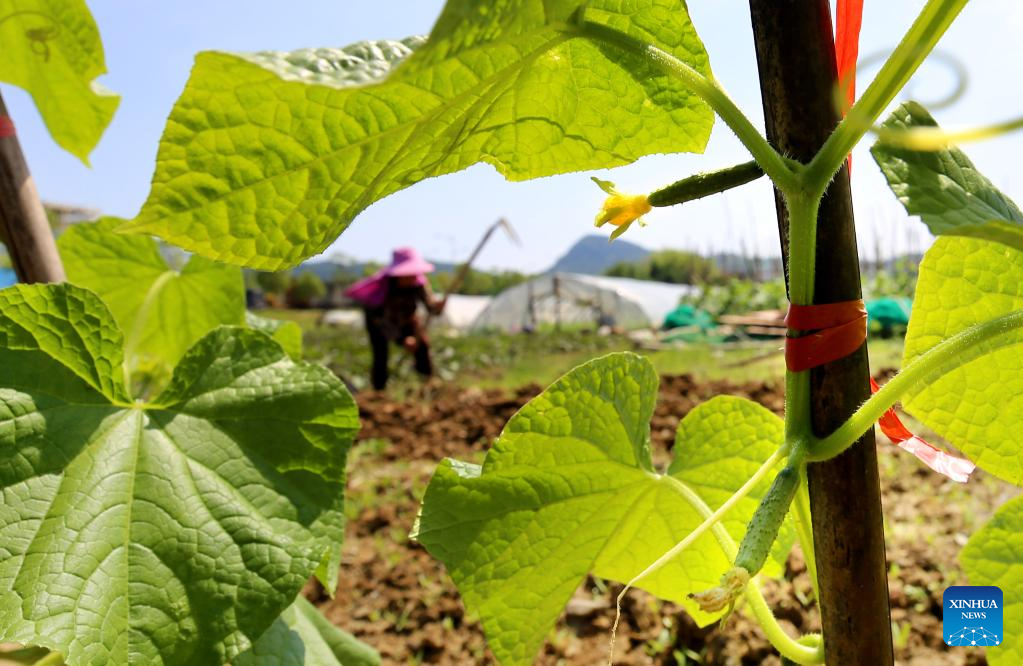 Farmers work in the fields in Matian Village of Qiannan Buyi and Miao Autonomous Prefecture, southwest China's Guizhou Province, May 4, 2022. (Photo by Gao Guihua/Xinhua)