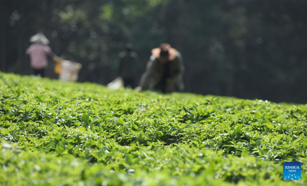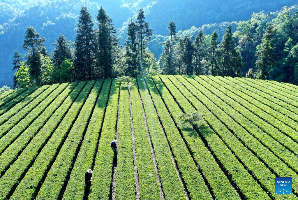 Aerial photo shows farmers working in a tea garden in Heping Village of Xuan'en County, Enshi Tujia and Miao Autonomous Prefecture, central China's Hubei Province, May 4, 2022. (Photo by Song Wen/Xinhua)
