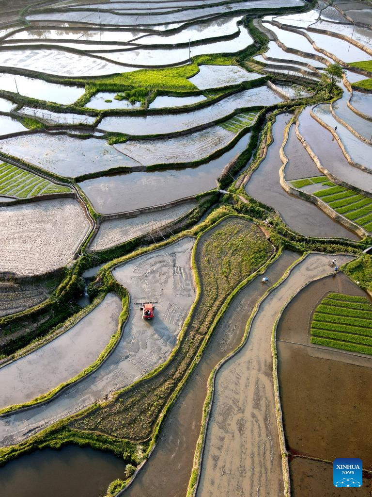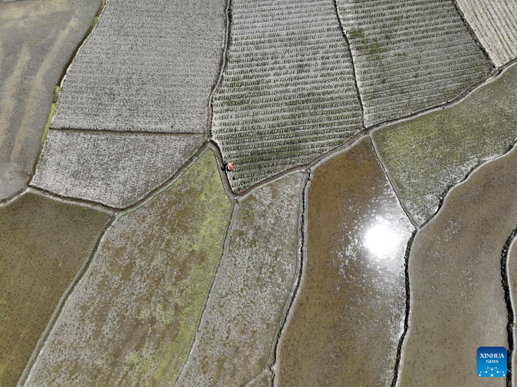 A farmer works in the fields in Shuangxi Village of Jing'an County, Yichun City, east China's Jiangxi Province, May 4, 2022. (Photo by Xu Zhongting/Xinhua)