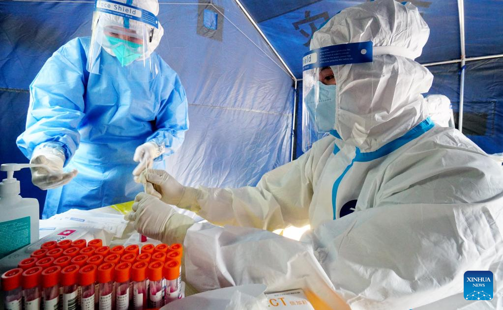Young volunteers work at a nucleic acid testing site in Fengtai District of Beijing, capital of China, May 4, 2022. Many young people chose to devote themselves into volunteering work at the front line of the fight against the recent resurgence of COVID-19 in Beijing on Wednesday, China's Youth Day. (Xinhua/Li Xin)