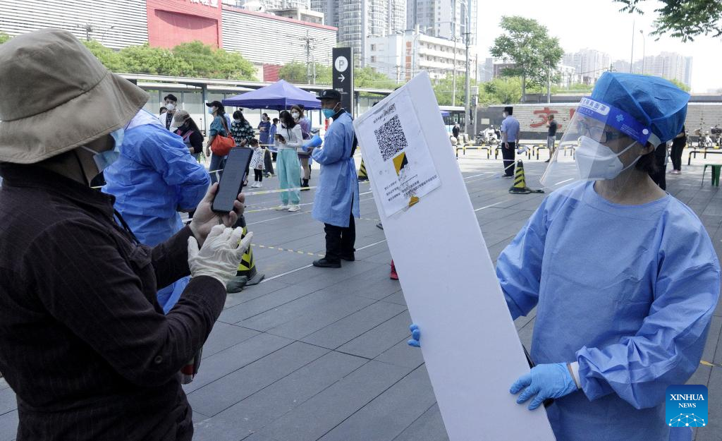 A young volunteer guides residents to register for the nucleic acid tests at a testing site in Chaoyang District of Beijing, capital of China, May 4, 2022. Many young people chose to devote themselves into volunteering work at the front line of the fight against the recent resurgence of COVID-19 in Beijing on Wednesday, China's Youth Day. (Xinhua/Li Xin)