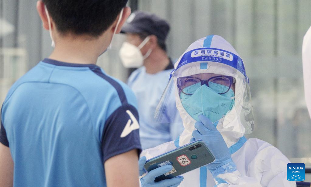 A young volunteer gets residents registered for the nucleic acid tests at a testing site in Chaoyang District of Beijing, capital of China, May 4, 2022. Many young people chose to devote themselves into volunteering work at the front line of the fight against the recent resurgence of COVID-19 in Beijing on Wednesday, China's Youth Day. (Xinhua/Li Xin)
