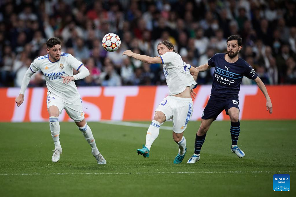 Real Madrid's Luka Modric (C) vies with Manchester City's Bernardo Silva (R) during the UEFA Champions League semifinal second leg football match between Real Madrid of Spain and Manchester City of England in Madrid, Spain, May 4, 2022. (Xinhua/Meng Dingbo)