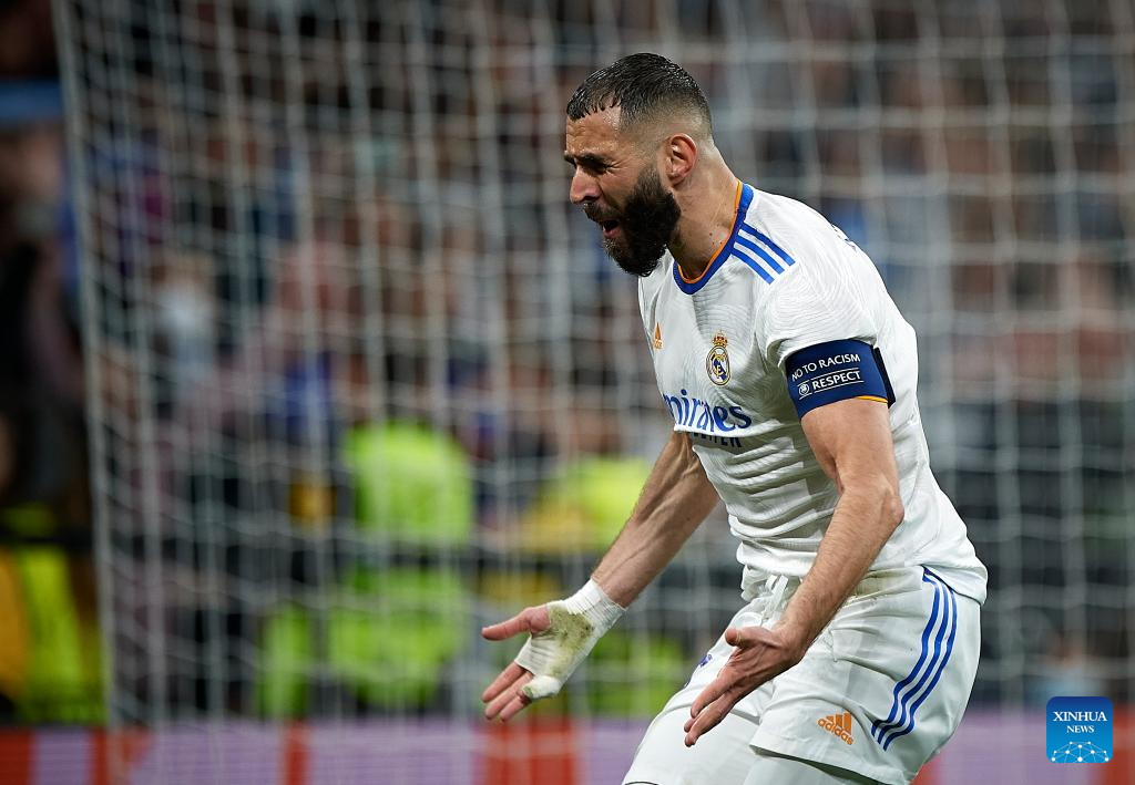 Real Madrid's Karim Benzema celebrates his goal during the UEFA Champions League semifinal second leg football match between Real Madrid of Spain and Manchester City of England in Madrid, Spain, May 4, 2022. (Photo by Pablo Morano/Xinhua)