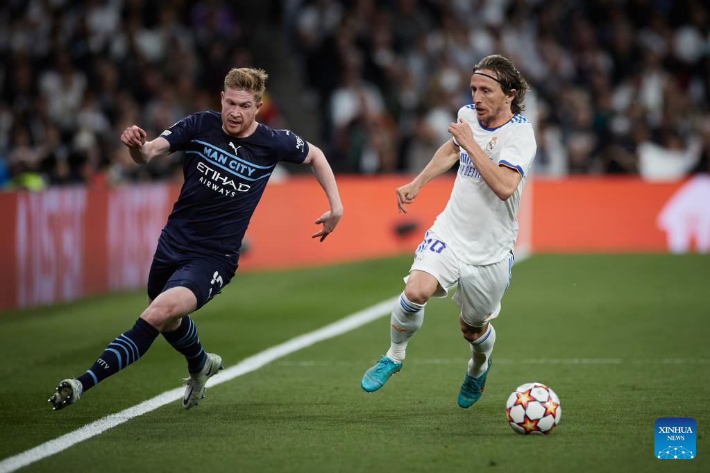 Real Madrid's Luka Modric (R) vies with Manchester City's Kevin De Bruyne during the UEFA Champions League semifinal second leg football match between Real Madrid of Spain and Manchester City of England in Madrid, Spain, May 4, 2022. (Xinhua/Meng Dingbo)