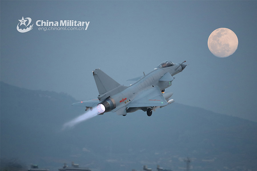 A fighter jet attached to an air force aviation unit under the PLA Southern Theatre Command soars to the sky in an around-the-clock flight training exercise at an air force base on April 18, 2022. (eng.chinamil.com.cn/Photo by Huang Rongkai)