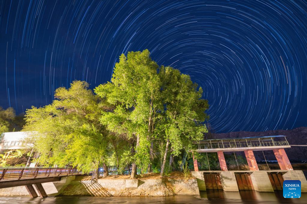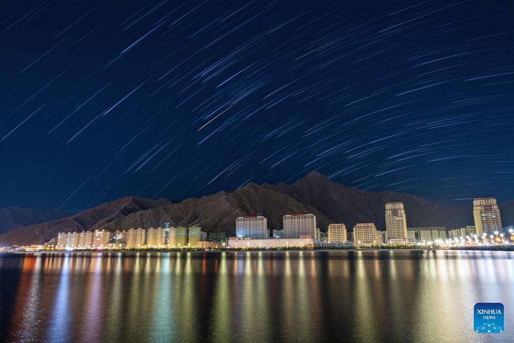 Composite photo shows star trails over Lhasa, southwest China's Tibet Autonomous Region, May 4, 2022. (Xinhua/Zhou Dixiao)