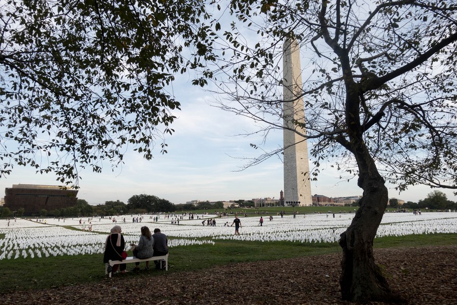 White flags honoring the lives lost to COVID-19 are seen on the National Mall in Washington, D.C., the United States, on Oct. 2, 2021. (Xinhua/Liu Jie)
