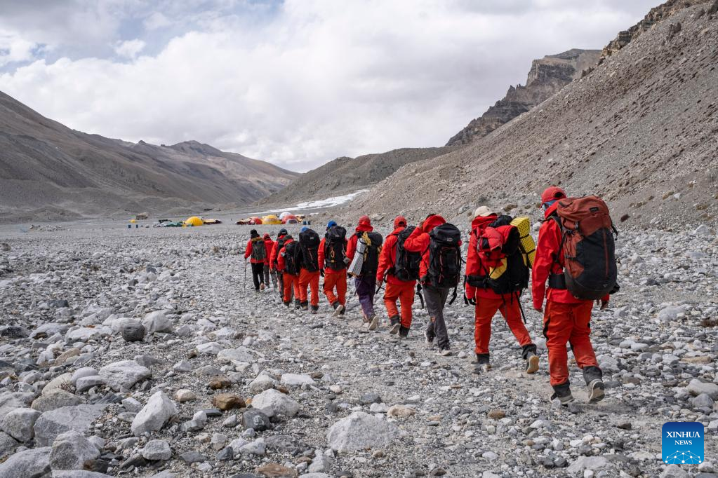 Members of a Chinese scientific expedition team are on the way back to the Mount Qomolangma base camp on May 5, 2022. A Chinese scientific expedition team returned safely to the Mount Qomolangma base camp on Thursday, after reaching the summit of the world's highest peak. All 13 members of the expedition team are in good physical condition. (Xinhua/Jiang Fan)