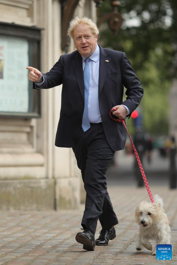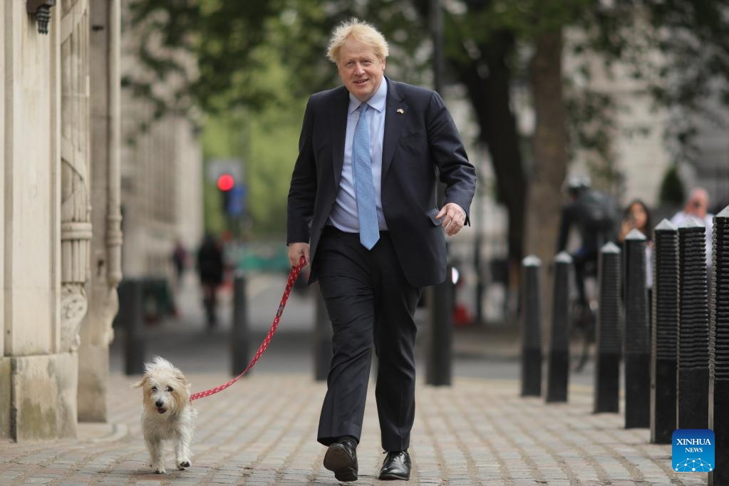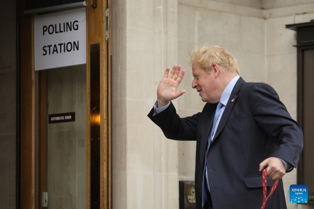 British Prime Minister and Conservative Party leader Boris Johnson goes to a polling station to cast his vote for the local elections in London, Britain, on May 5, 2022. Polling stations across Britain opened early Thursday as voters went for local elections. (Photo by Tim Ireland/Xinhua)