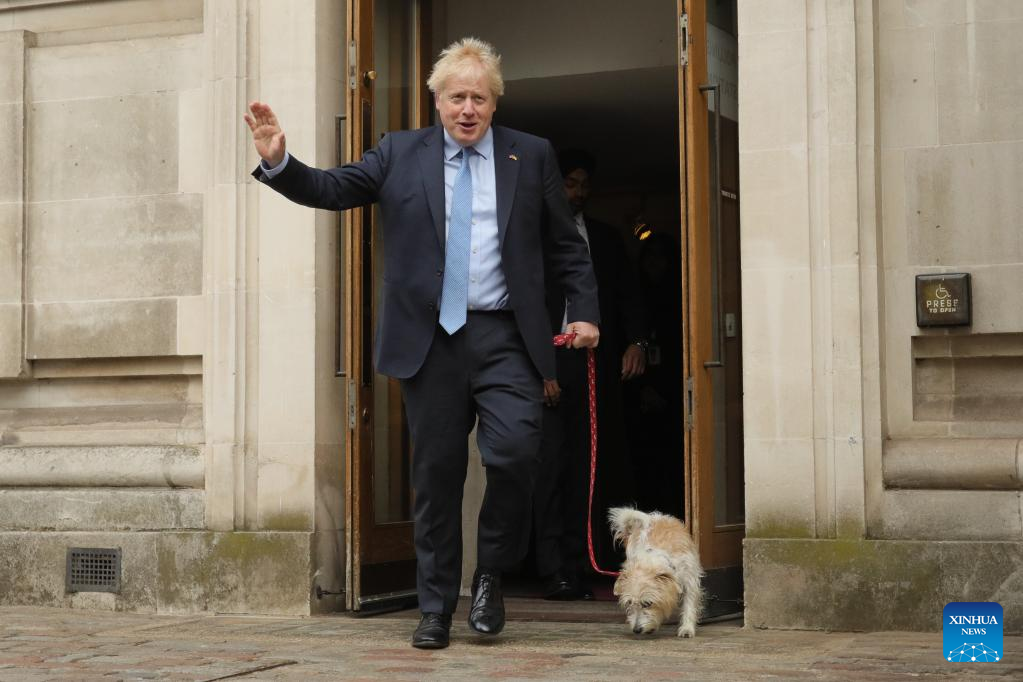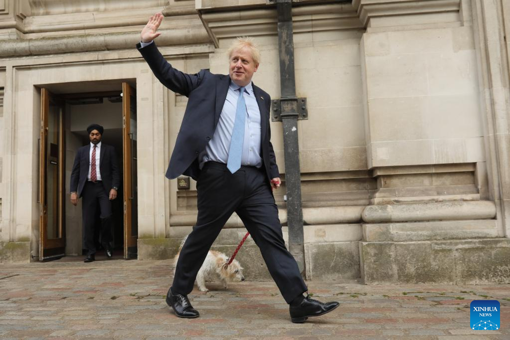 British Prime Minister and Conservative Party leader Boris Johnson leaves a polling station after casting his vote for the local elections in London, Britain, on May 5, 2022. Polling stations across Britain opened early Thursday as voters went for local elections. (Photo by Tim Ireland/Xinhua)