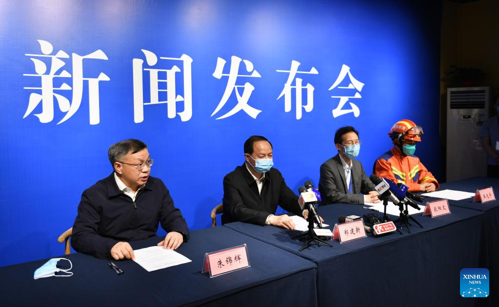 A press briefing on the collapse of a self-built residential structure is held in Changsha, central China's Hunan Province, May 5, 2022. The death toll of a self-built residential structure collapse in central China's Hunan Province has risen to 26 as of Thursday night, local authorities have said. (Xinhua/Chen Zhenhai)