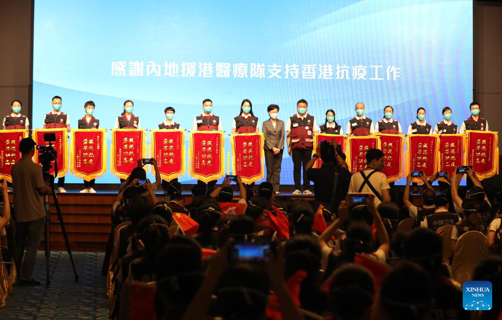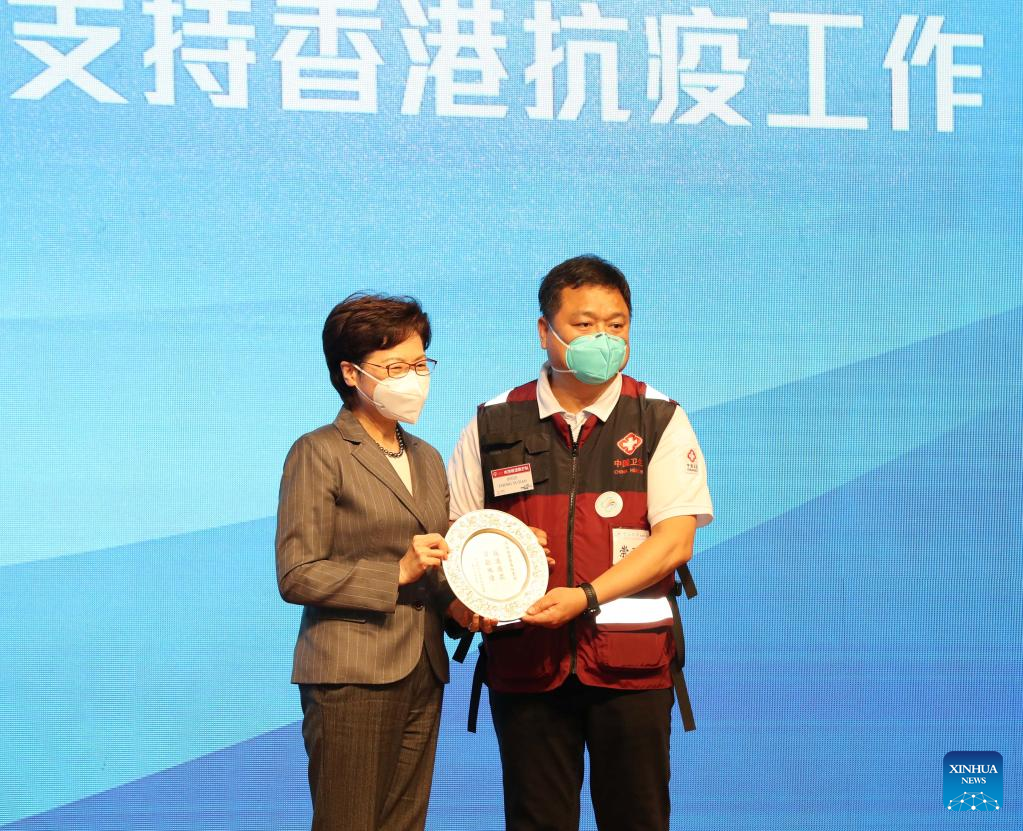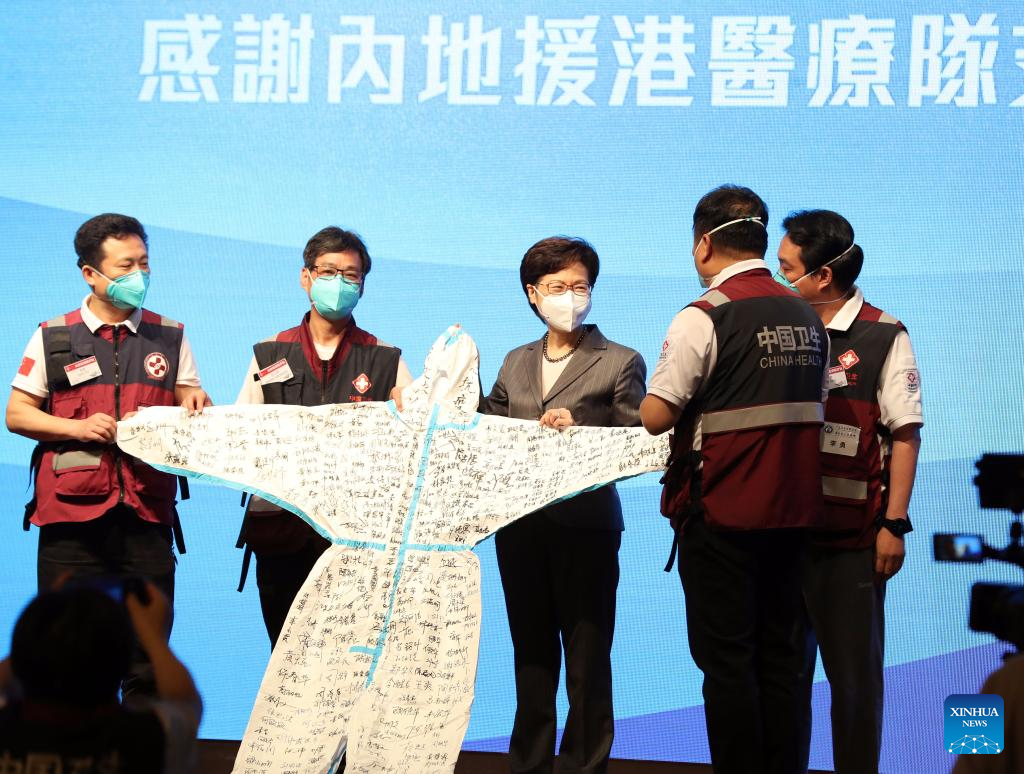 HONG KONG, May 5 (Xinhua) -- Chief Executive of the Hong Kong Special Administrative Region (HKSAR) Carrie Lam on Thursday bade farewell to the last section of the mainland medical team departing Hong Kong during an appreciation and farewell ceremony organized by the HKSAR government.