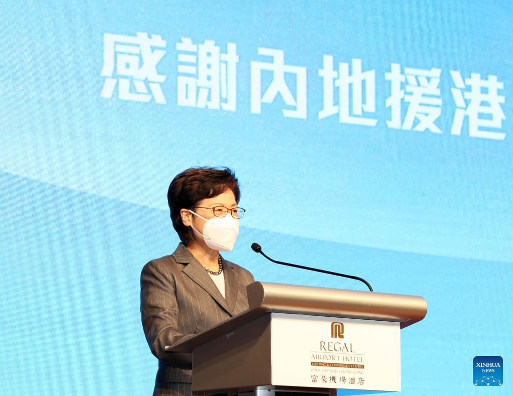 Chief Executive of the Hong Kong Special Administrative Region (HKSAR) Carrie Lam addresses an appreciation and farewell ceremony organized by the HKSAR government in south China's Hong Kong, May 5, 2022. (Xinhua/Li Gang)