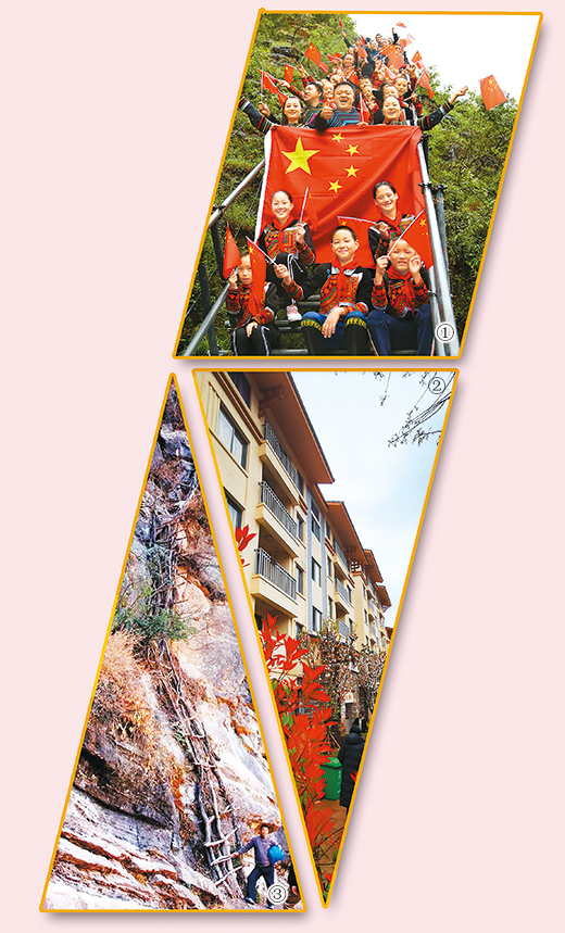 ① Villagers of Atulie’er village, which is situated on a cliff in Zhaojue county, Liangshan Yi Autonomous Prefecture of southwest China’s Sichuan Province, pose for photos during an event marking the 70th anniversary of the founding of the People’s Republic of China on the handrail-equipped steel ladder in September 2019. (Photo/Ake Jiushe)