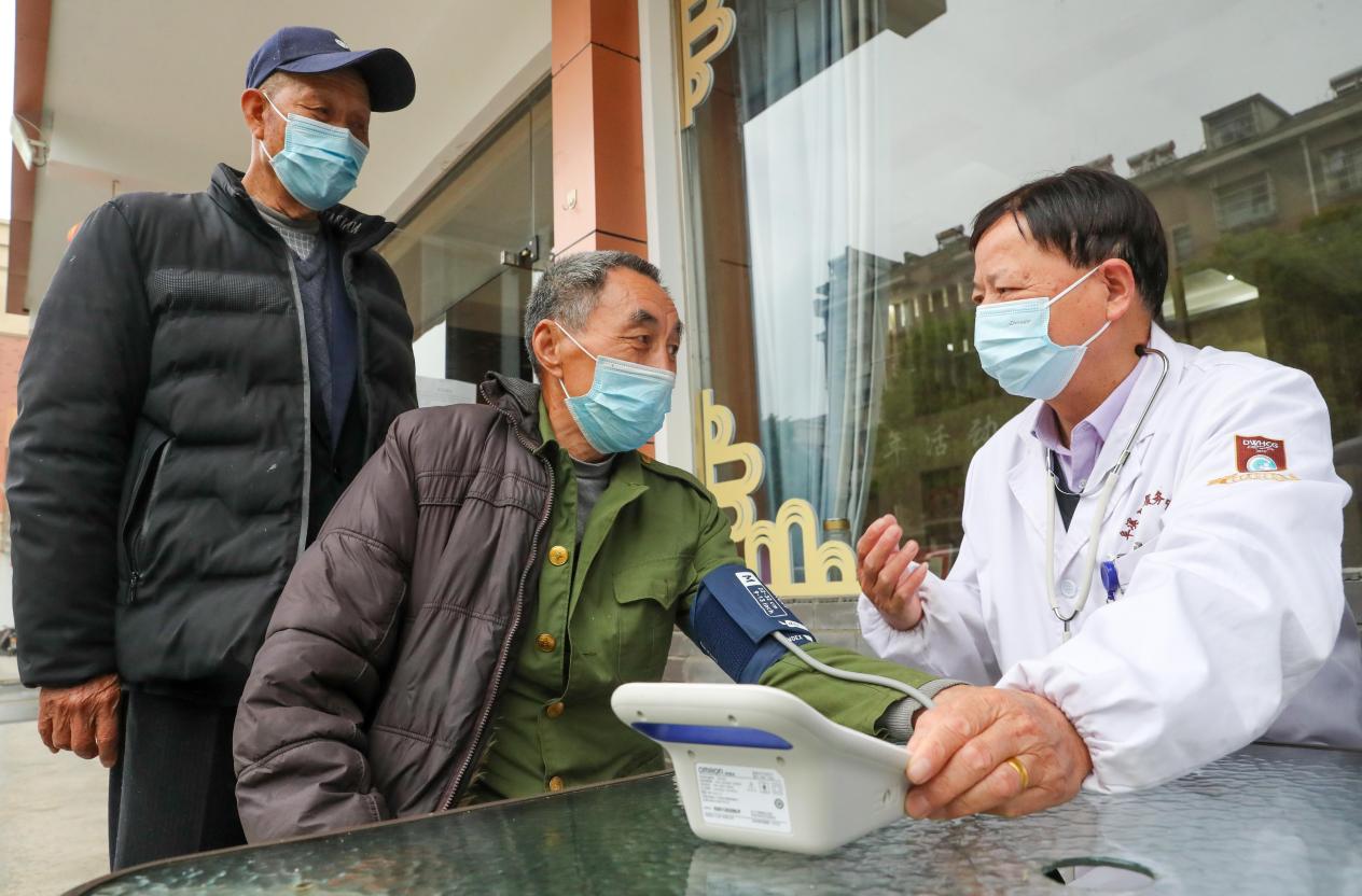 A family doctor tests residents’ blood pressure at a community in Fuxi subdistrict, Deqing county, Huzhou city, east China’s Zhejiang province, April 13, 2022. (People’s Daily Online/Wang Shucheng)