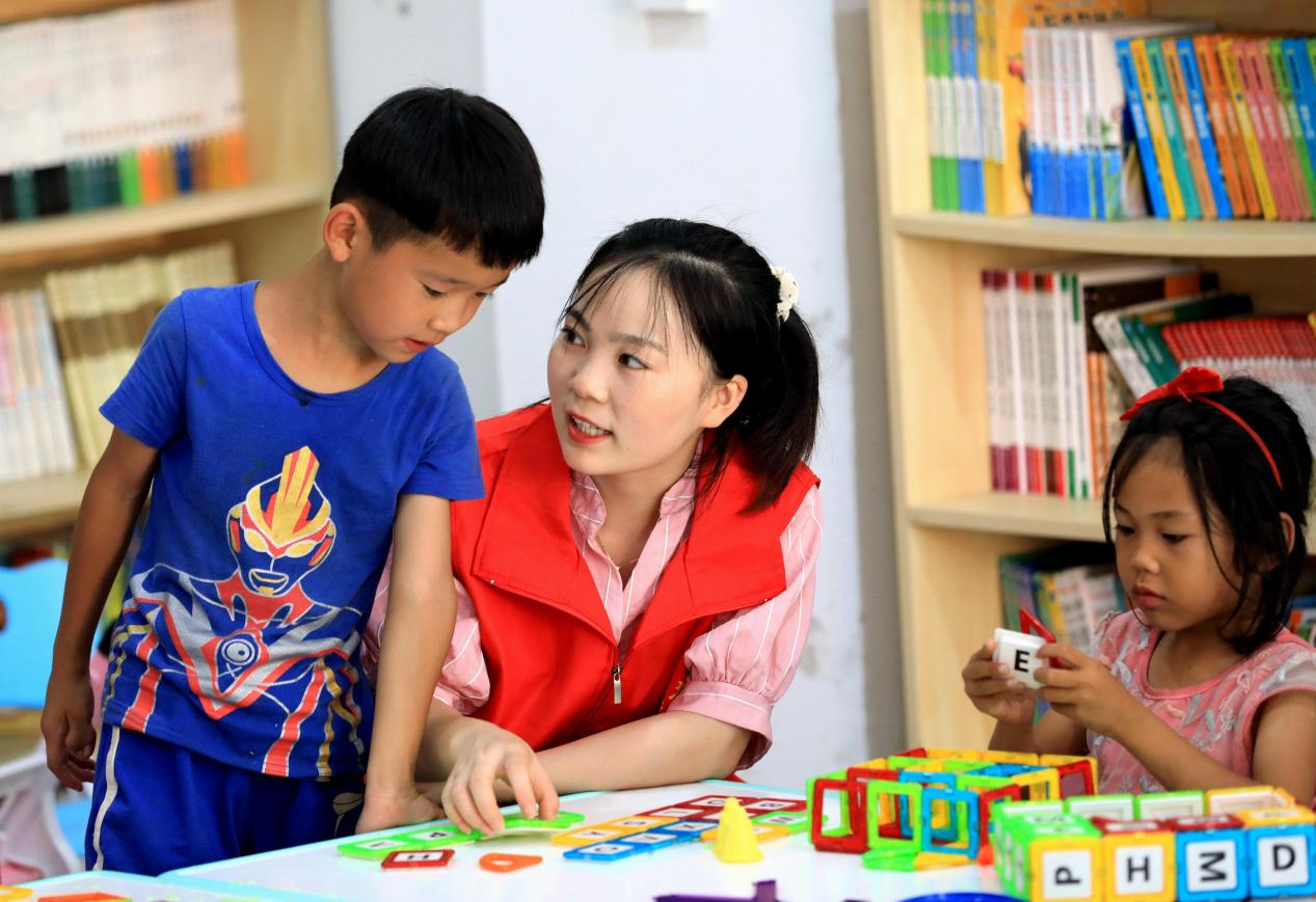A volunteer and two kids play with building blocks at a poverty alleviation relocation site in Gangbian township, Congjiang county, southwest China’s Guizhou province, August 2, 2021. (People’s Daily Online/Luo Jinglai)