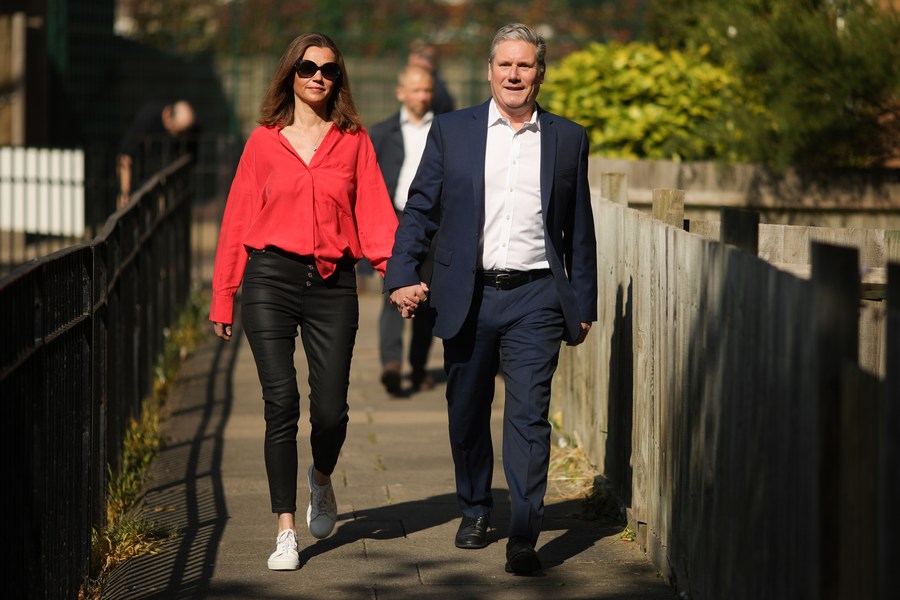 Britain's Labour Party leader Keir Starmer (R, front) and his wife Victoria Starmer walk to a polling station to vote in local elections in London, Britain on May 5, 2022. (Photo by Tim Ireland/Xinhua)