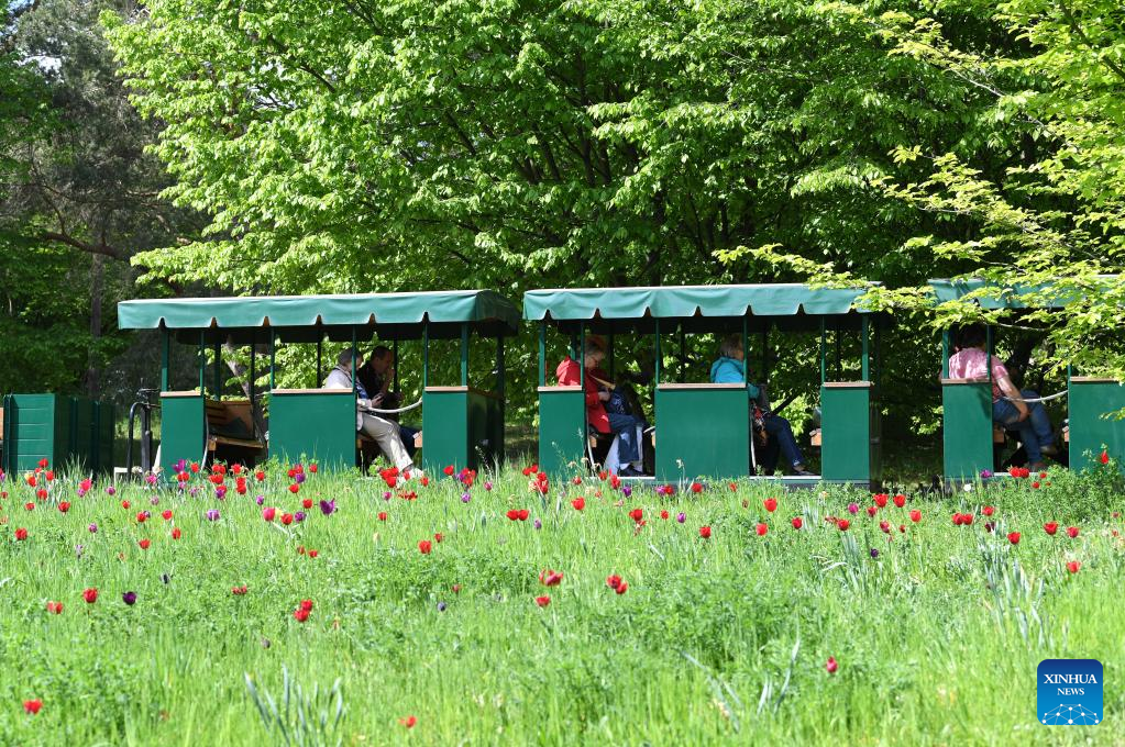 People take a mini train at Britzer Garten in Berlin, capital of Germany, May 6, 2022. (Xinhua/Ren Pengfei)