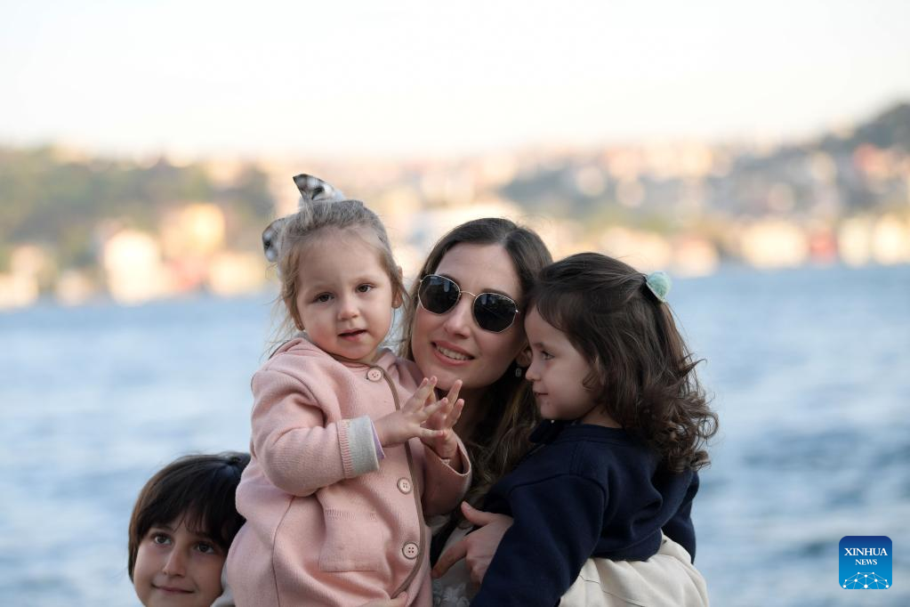 A woman poses for a photo with children in Istanbul, Turkey, May 5, 2022. (Xinhua/Shadati)