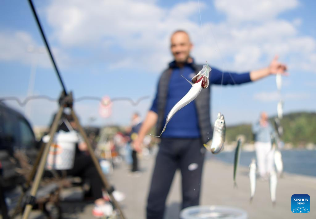 A fishing lover shows newly-caught fish near the Bosporus Strait in Istanbul, Turkey, May 5, 2022. (Xinhua/Shadati)