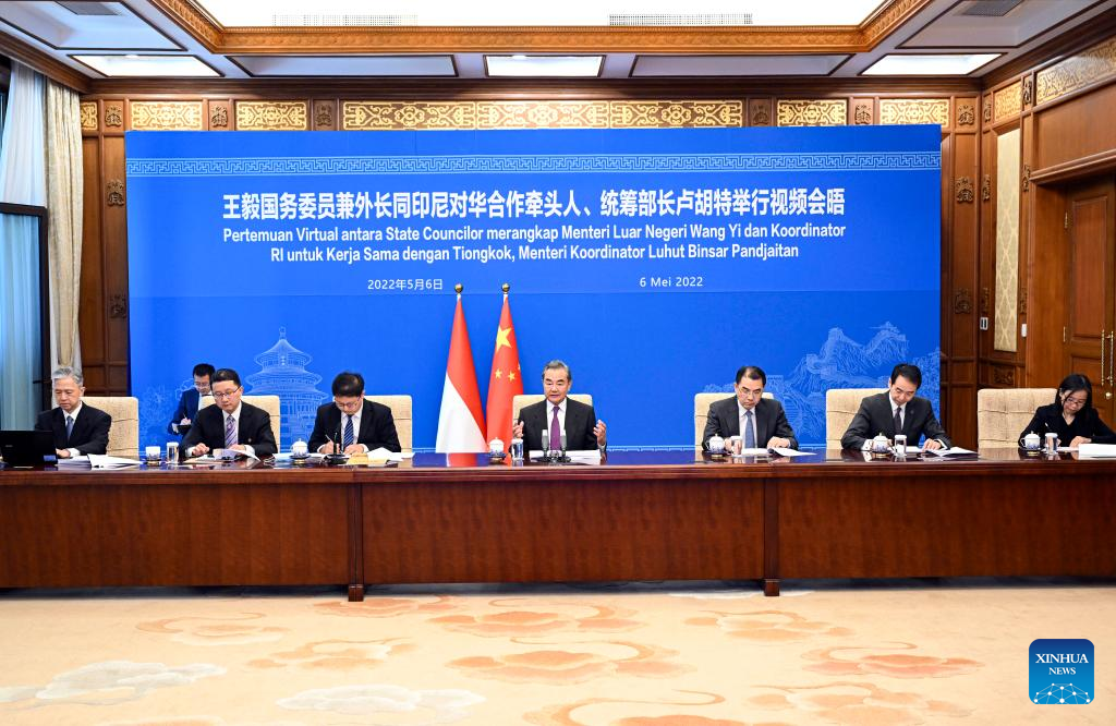 BEIJING, May 6 (Xinhua) -- Chinese State Councilor and Foreign Minister Wang Yi met with Indonesia's Coordinator for Cooperation with China and Coordinating Minister Luhut Binsar Pandjaitan via video link on Friday, with the two sides agreeing to jointly safeguard peace and stability in East Asia.