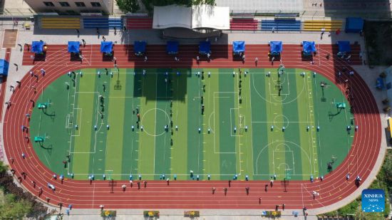 Aerial photo shows people lining up for nucleic acid tests in Chengxi District of Xining, northwest China's Qinghai Province, May 7, 2022. (Xinhua/Zhang Long)