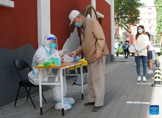 A medical worker takes a swab sample from a resident for nucleic acid test in Chaoyang District, Beijing, capital of China, May 7, 2022. (Xinhua/Li Xin)