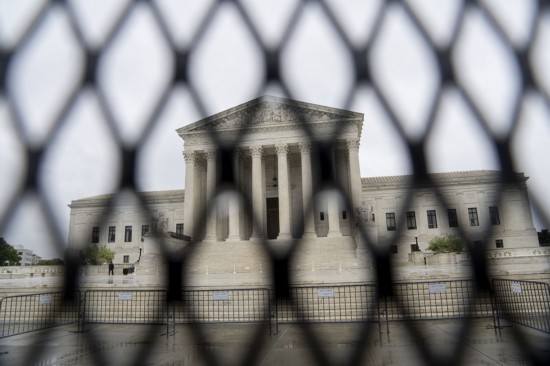 Photo taken on May 6, 2022 shows the U.S. Supreme Court and a barrier fence in Washington, D.C., the United States. (Xinhua/Liu Jie)