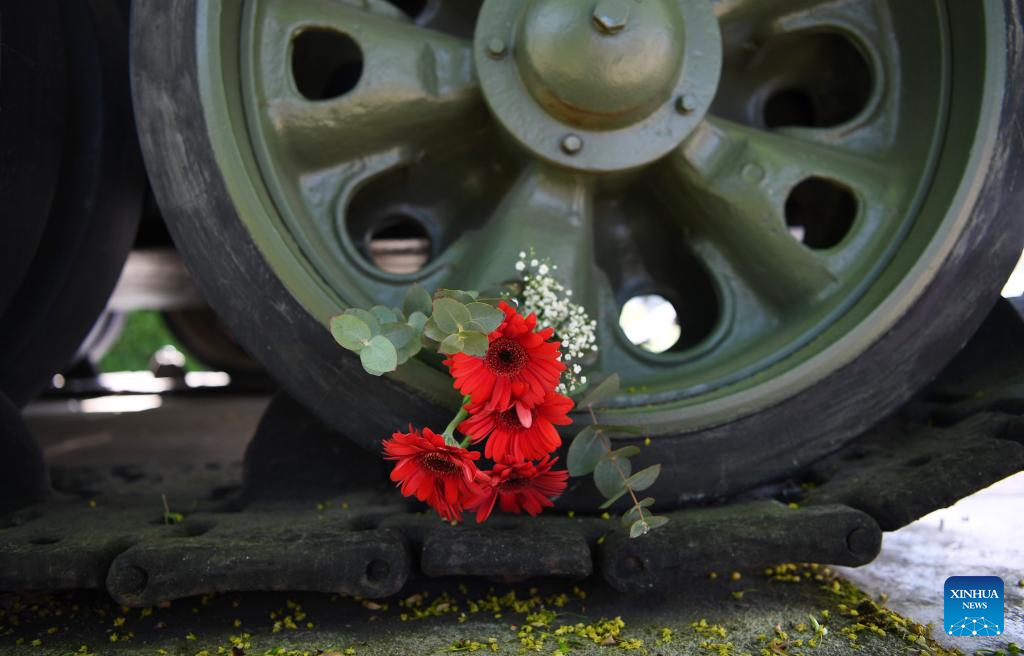 Flowers are presented on the wheel of a tank to commemorate the 77th anniversary of the end of World War II in Europe, known as Victory in Europe Day, at German-Russian Museum in Berlin, capital of Germany, on May 8, 2022. (Xinhua/Ren Pengfei)