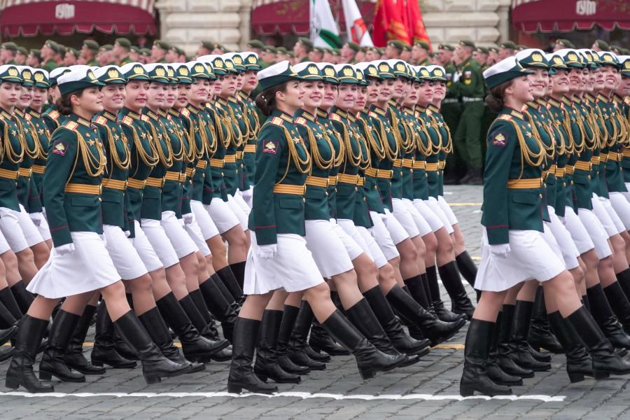 Servicewomen march during the military parade marking the 76th anniversary of the Soviet victory in the Great Patriotic War on Red Square in Moscow, Russia, May 9, 2021. (Xinhua/Yuan Xinfang)