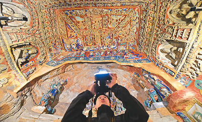 A staff member of the Yungang Grottoes Research Institute collects data in Yungang Grottoes in Datong, Shanxi Province. (Photo/Xinhua)