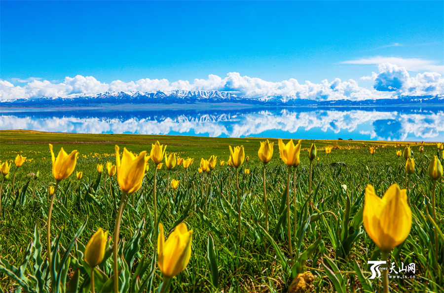 Photo shows wild tulips in full bloom on the shore of the Sayram Lake in northwest China's Xinjiang Uygur Autonomous Region. (Photo/ts.cn)