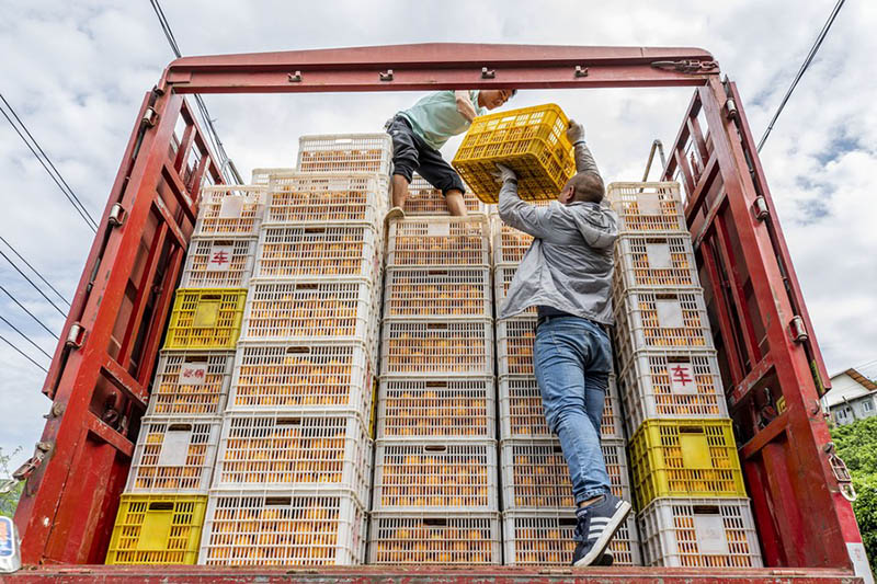 Villagers load oranges onto a truck in Zigui County, central China's Hubei Province, April 26, 2022. (Photo by Nie Shuang/Xinhua)