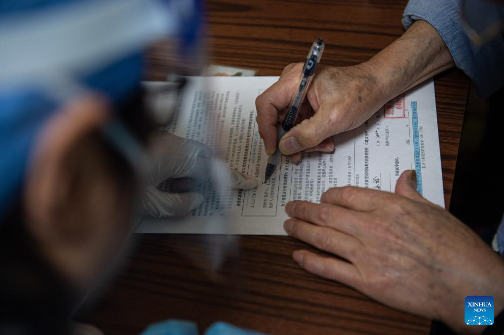 An elderly resident signs on the informed consent sheet before receiving his shot of COVID-19 vaccine at home in Dongcheng District of Beijing, capital of China, May 10, 2022. Medical workers on Tuesday provided home services to some elderly residents who preferred to receive COVID-19 vaccination at home due to their health conditions. (Xinhua/Chen Zhonghao)