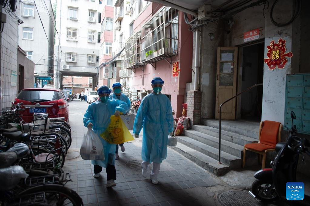 Medical workers leave a residential building after finishing the vaccination for an elderly resident in Dongcheng District of Beijing, capital of China, May 10, 2022. Medical workers on Tuesday provided home services to some elderly residents who preferred to receive COVID-19 vaccination at home due to their health conditions. (Xinhua/Chen Zhonghao)
