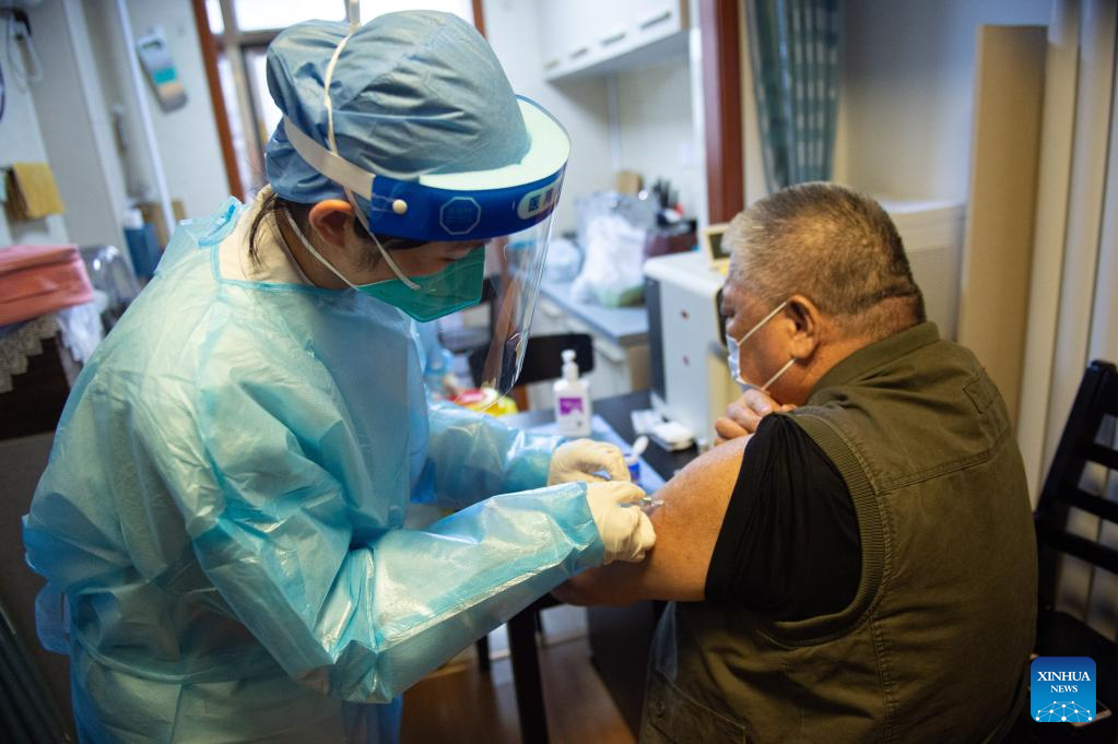 An elderly resident receives a shot of COVID-19 vaccine at home in Dongcheng District of Beijing, capital of China, May 10, 2022. Medical workers on Tuesday provided home services to some elderly residents who preferred to receive COVID-19 vaccination at home due to their health conditions. (Xinhua/Chen Zhonghao)