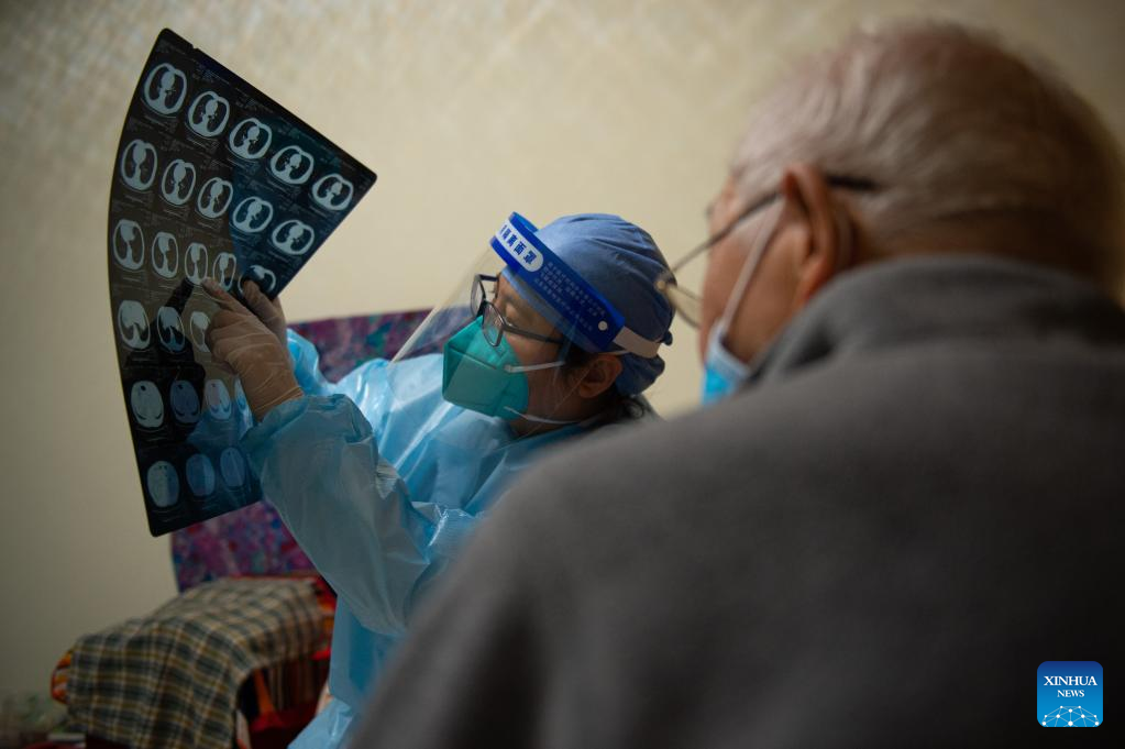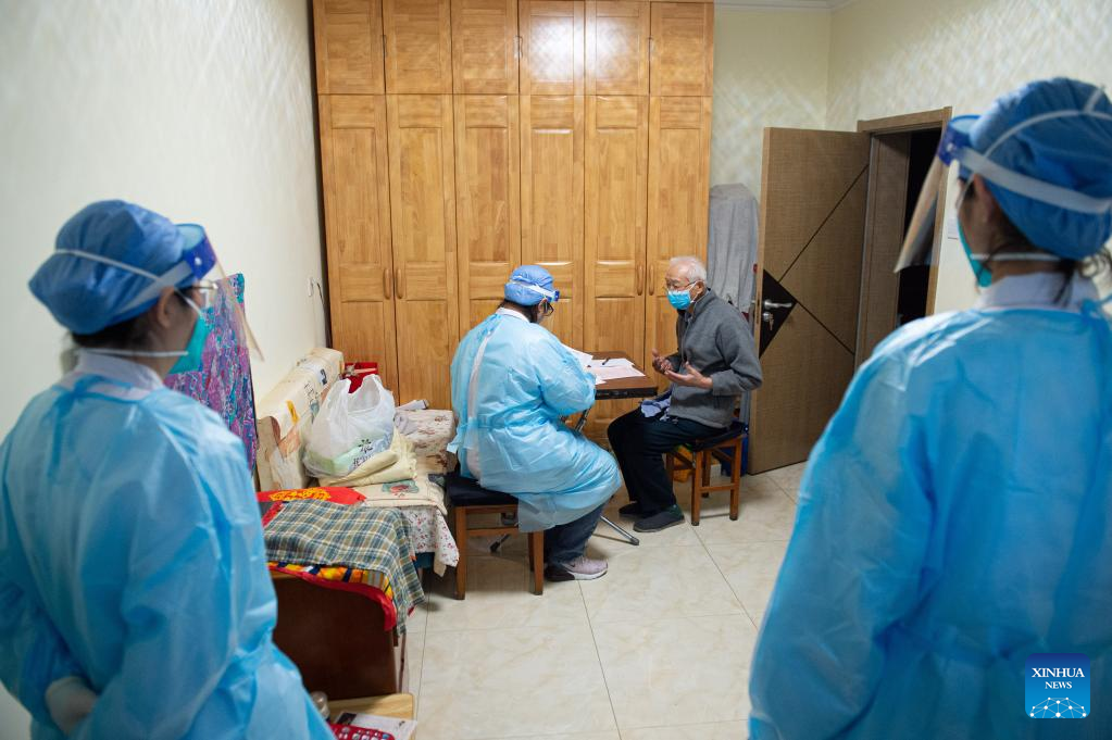 An elderly resident has his blood pressure checked before receiving his shot of COVID-19 vaccine at home in Dongcheng District of Beijing, capital of China, May 10, 2022. Medical workers on Tuesday provided home services to some elderly residents who preferred to receive COVID-19 vaccination at home due to their health conditions. (Xinhua/Chen Zhonghao)