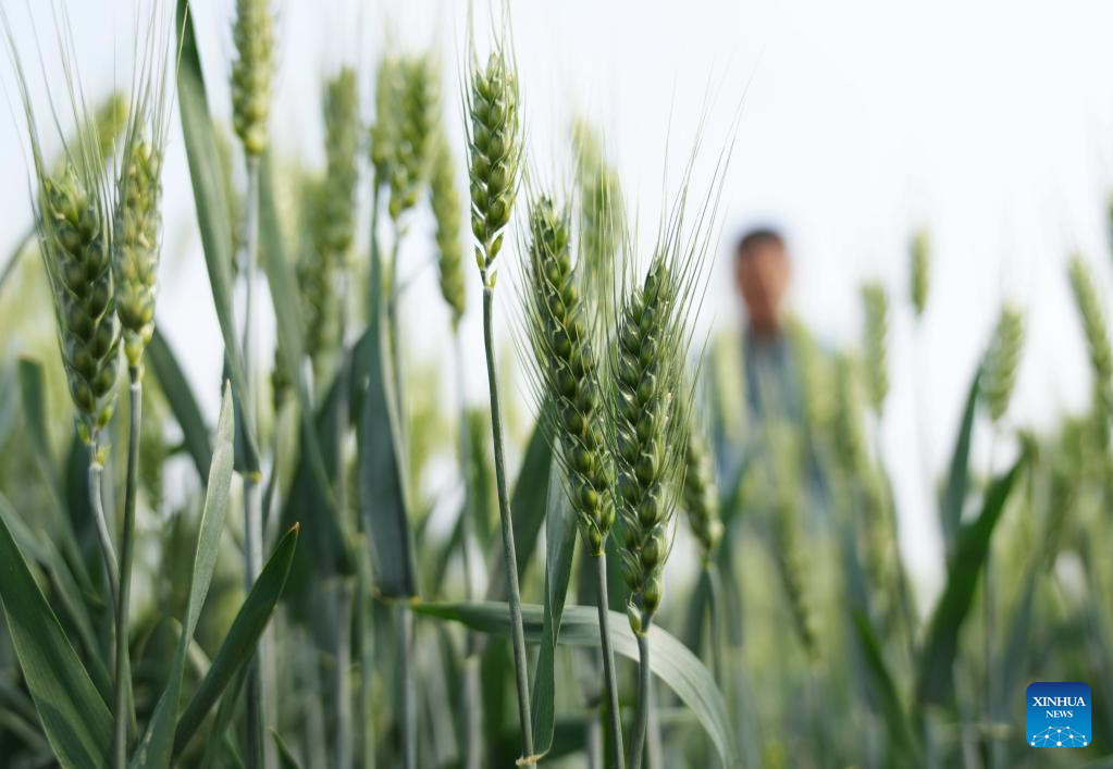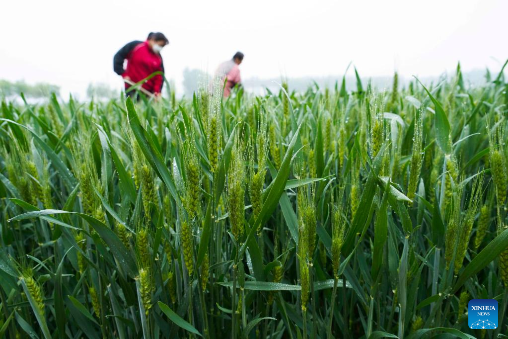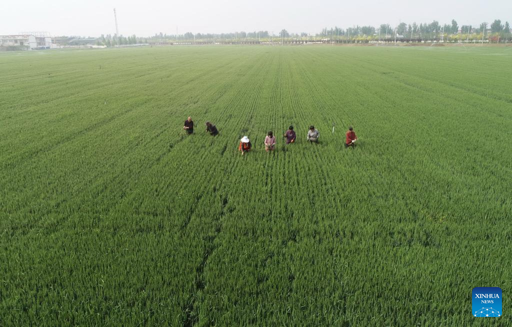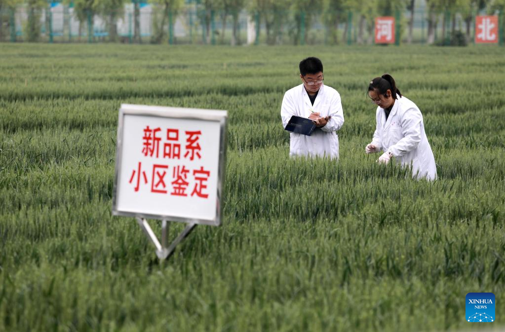 Agricultural experts check the growth of wheat in a breeding field in Shijiazhuang, north China's Hebei Province, May 9, 2022. Hebei has stepped up efforts on farming activities recently. The province's spring sowing area of grain is expected to reach about 1.74 million hectares this year. (Photo by Liang Zidong/Xinhua)
