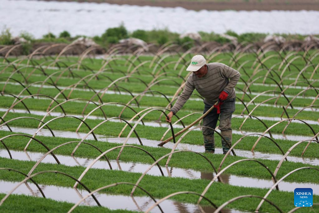 Farmer works at a rice seedling breeding base in Tangshan, north China's Hebei Province, May 9, 2022. Hebei has stepped up efforts on farming activities recently. The province's spring sowing area of grain is expected to reach about 1.74 million hectares this year. (Photo by Li Xiuqing/Xinhua)