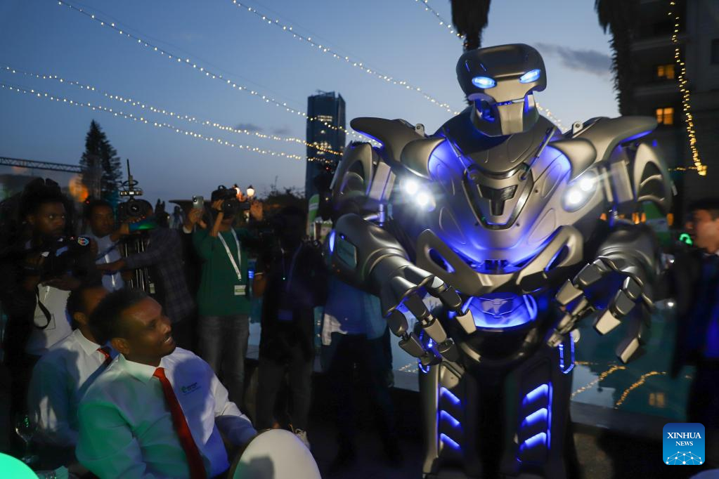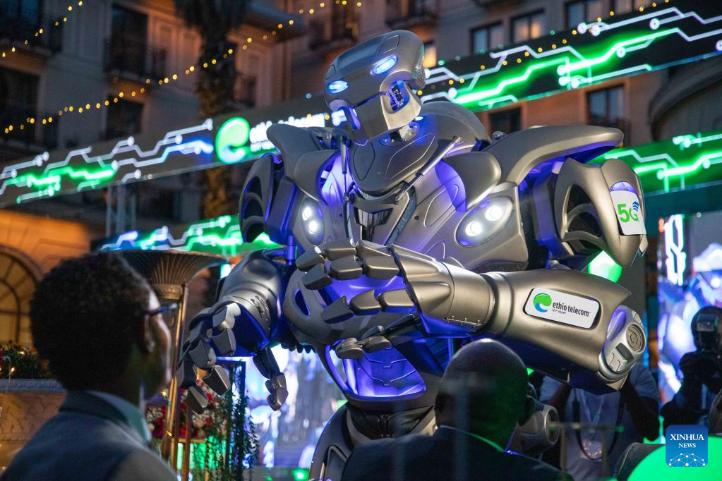 A 5G technology supported robot interacts with participants during the launching ceremony of pre-commercial 5G services trial in Addis Ababa, Ethiopia, on May 9, 2022. Ethiopia's state-owned Ethio-Telecom on Monday evening launched a pre-commercial 5G services trial in the capital Addis Ababa in partnership with Chinese telecom giant Huawei. (Xinhua/Michael Tewelde)