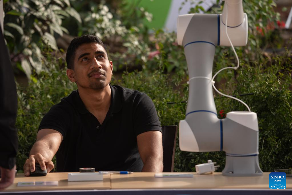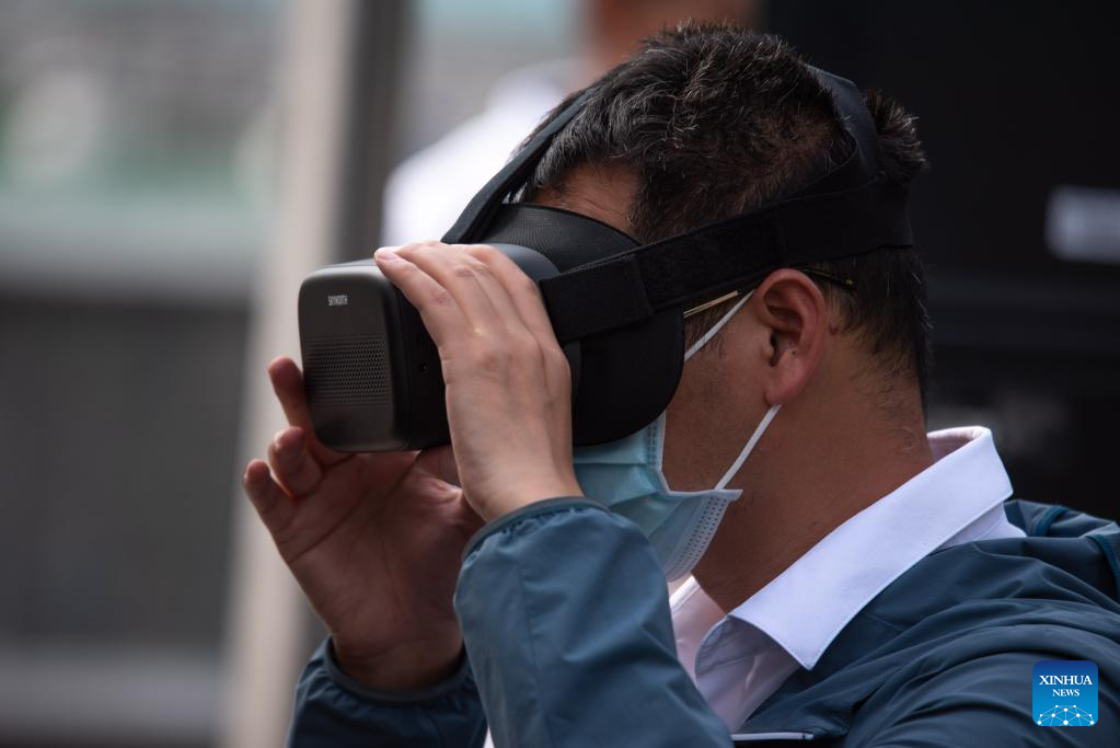 A participant experiences 5G service demonstrations during the launching ceremony of pre-commercial 5G services trial in Addis Ababa, Ethiopia, on May 9, 2022. Ethiopia's state-owned Ethio-Telecom on Monday evening launched a pre-commercial 5G services trial in the capital Addis Ababa in partnership with Chinese telecom giant Huawei. (Xinhua/Michael Tewelde)