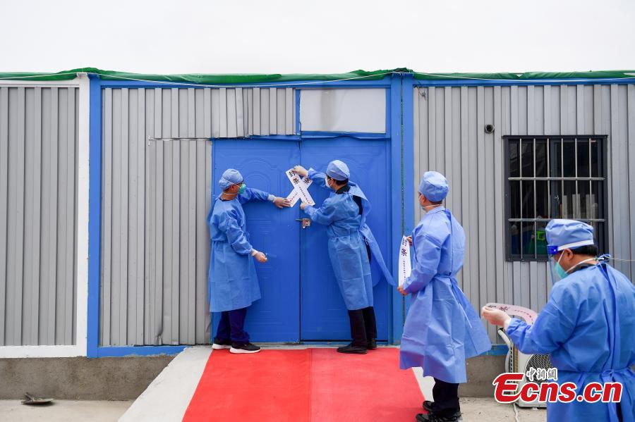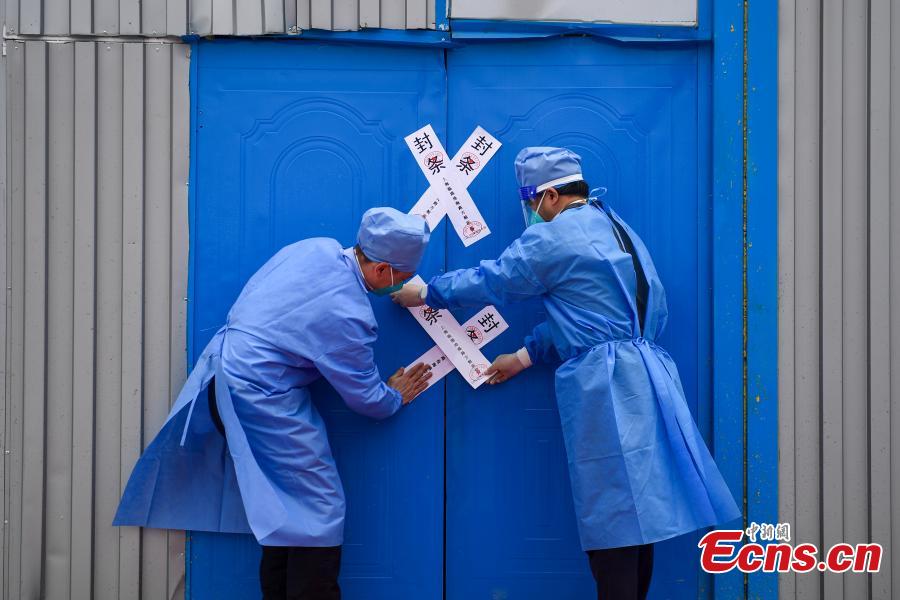 Staff members put on seals on door at a makeshift hospital in Lingang, east China's Shanghai, May 10, 2022. The makeshift hospital was officially closed as new COVID-19 infections continue to go down in Shanghai. (Photo: China News Service/Tian Yuhao)
