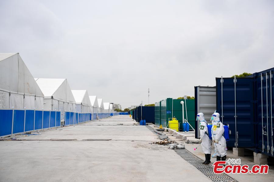 Staff members conduct disinfections at a makeshift hospital in Lingang, east China's Shanghai, May 10, 2022. (Photo: China News Service/Tian Yuhao)
