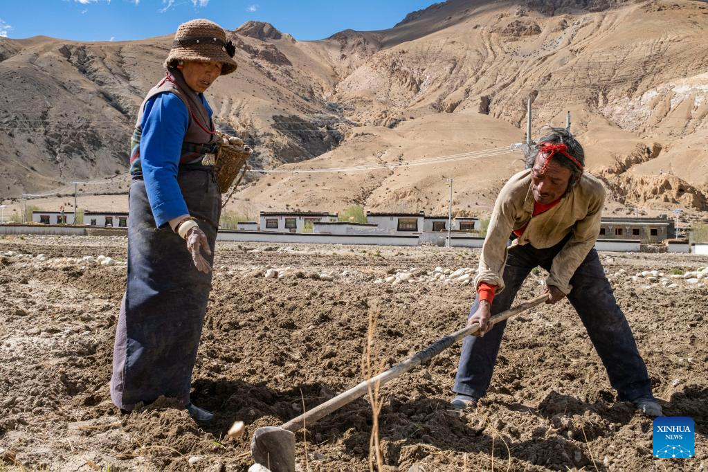 Villagers work in a field in Zhaxizom Township in Tingri County, southwest China's Tibet Autonomous Region, May 10, 2022. At an altitude of about 4,200 meters, Zhaxizom is the nearest administrative township to Mount Qomolangma. Due to the high altitude and low temperature, spring farming here does not begin until May. (Xinhua/Sun Fei)