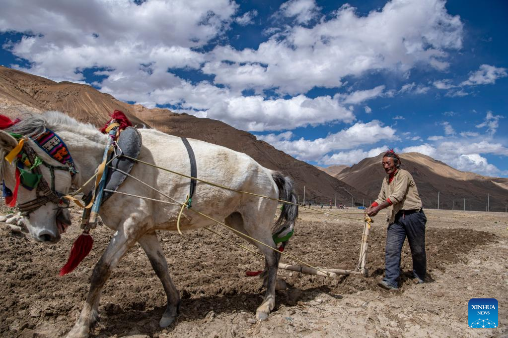 A villager works in a field in Zhaxizom Township in Tingri County, southwest China's Tibet Autonomous Region, May 10, 2022. At an altitude of about 4,200 meters, Zhaxizom is the nearest administrative township to Mount Qomolangma. Due to the high altitude and low temperature, spring farming here does not begin until May. (Xinhua/Sun Fei)