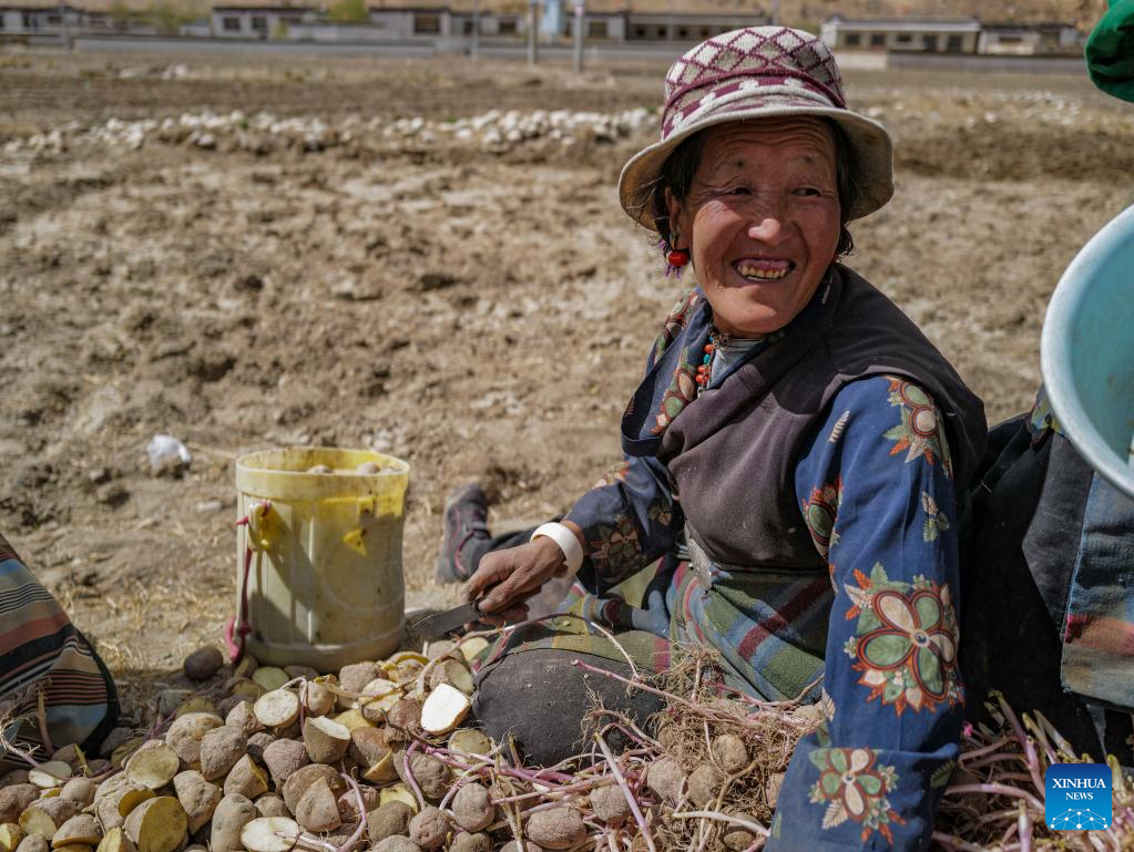 Villagers cut potatoes in a field in Zhaxizom Township in Tingri County, southwest China's Tibet Autonomous Region, May 10, 2022. At an altitude of about 4,200 meters, Zhaxizom is the nearest administrative township to Mount Qomolangma. Due to the high altitude and low temperature, spring farming here does not begin until May. (Xinhua/Sun Fei)