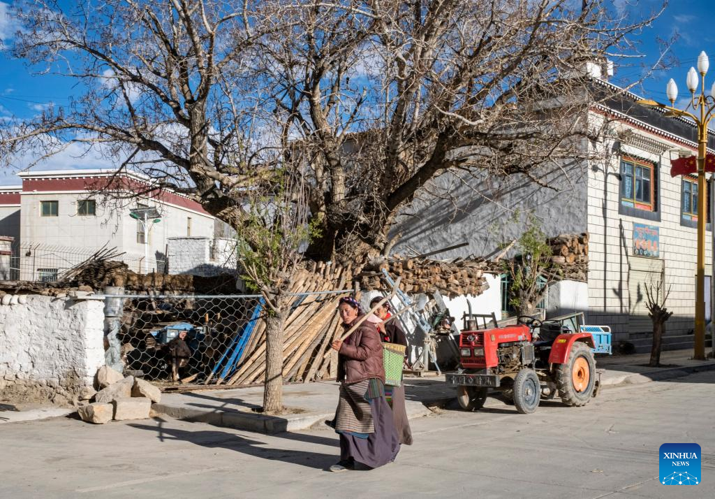Villagers are seen after farming in Zhaxizom Township in Tingri County, southwest China's Tibet Autonomous Region, May 9, 2022. At an altitude of about 4,200 meters, Zhaxizom is the nearest administrative township to Mount Qomolangma. Due to the high altitude and low temperature, spring farming here does not begin until May. (Xinhua/Sun Fei)